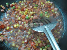 5、炒鍋放少許油,下火腿丁和彩蔬粒炒勻。